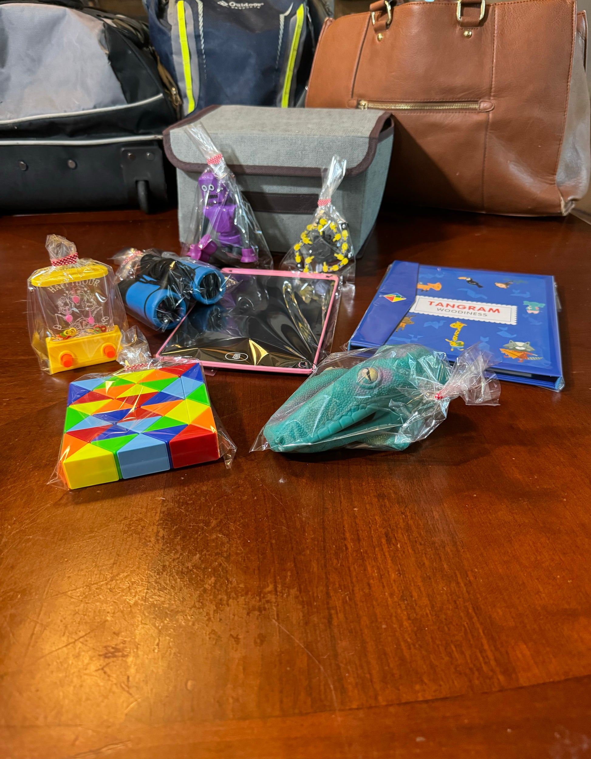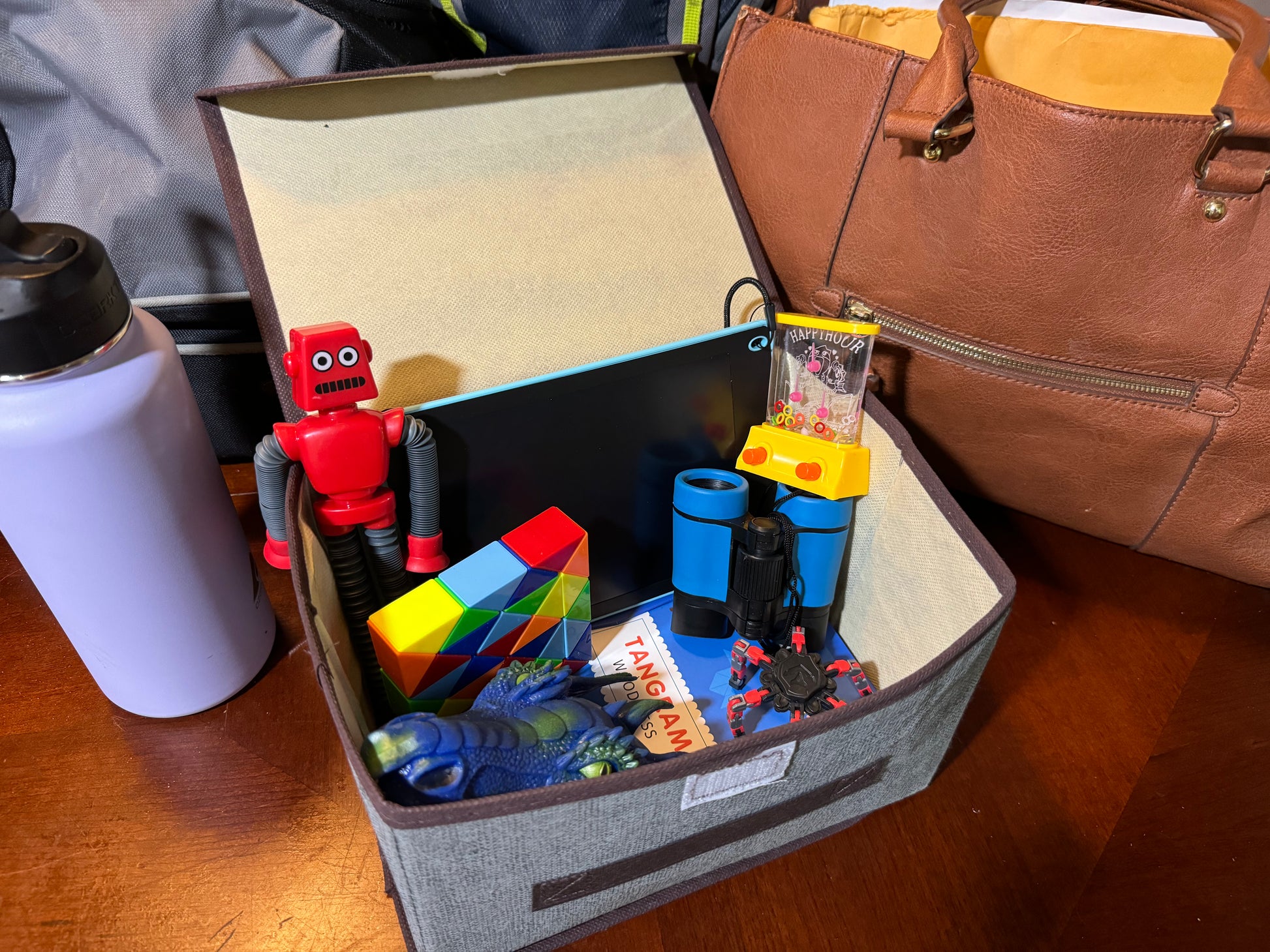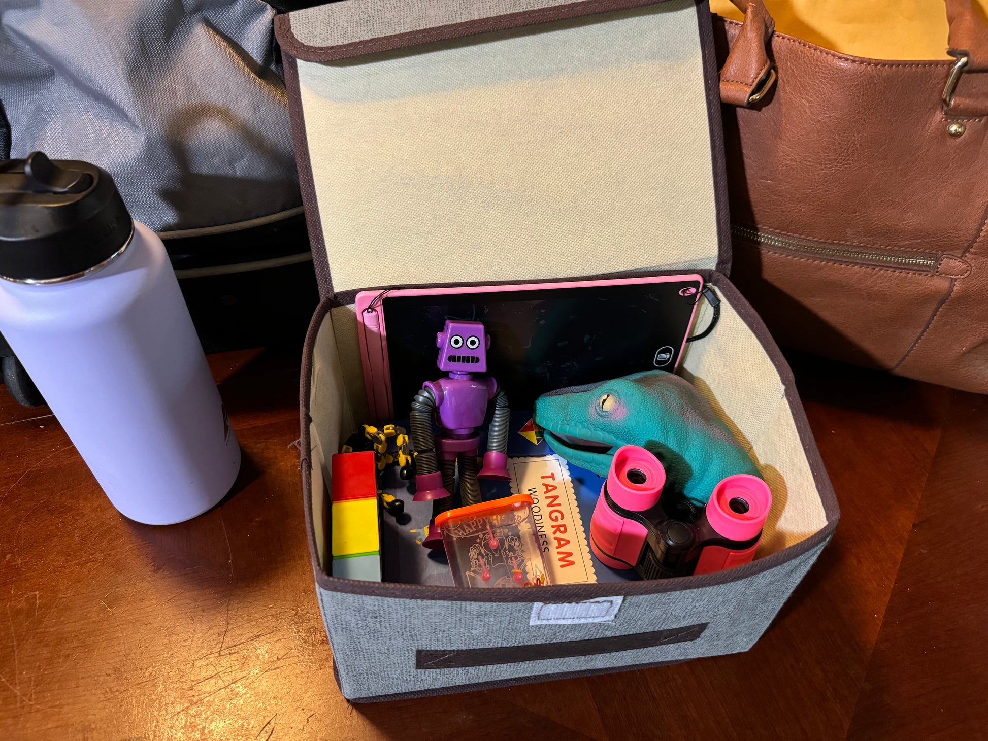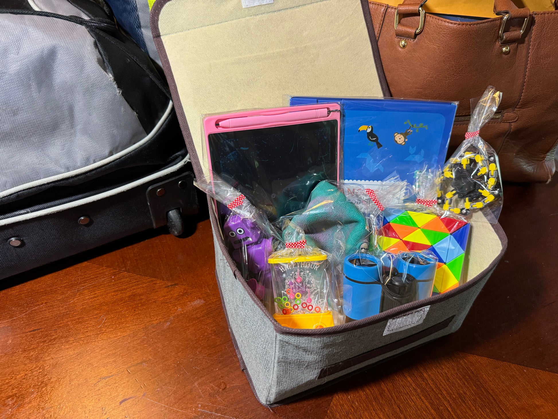 Spread these 8 screen-free, parent-friendly toys out across your trip and watch the miles tick by in (relative) peace. Inside this kit's compact, collapsible storage container are a pair of binoculars, a magnetic tangram book, an LED drawing pad, a suction cup robot, a transforming fidget spinner, a hand-held water game, a 36 piece block puzzle, and a stretchy hand puppet!